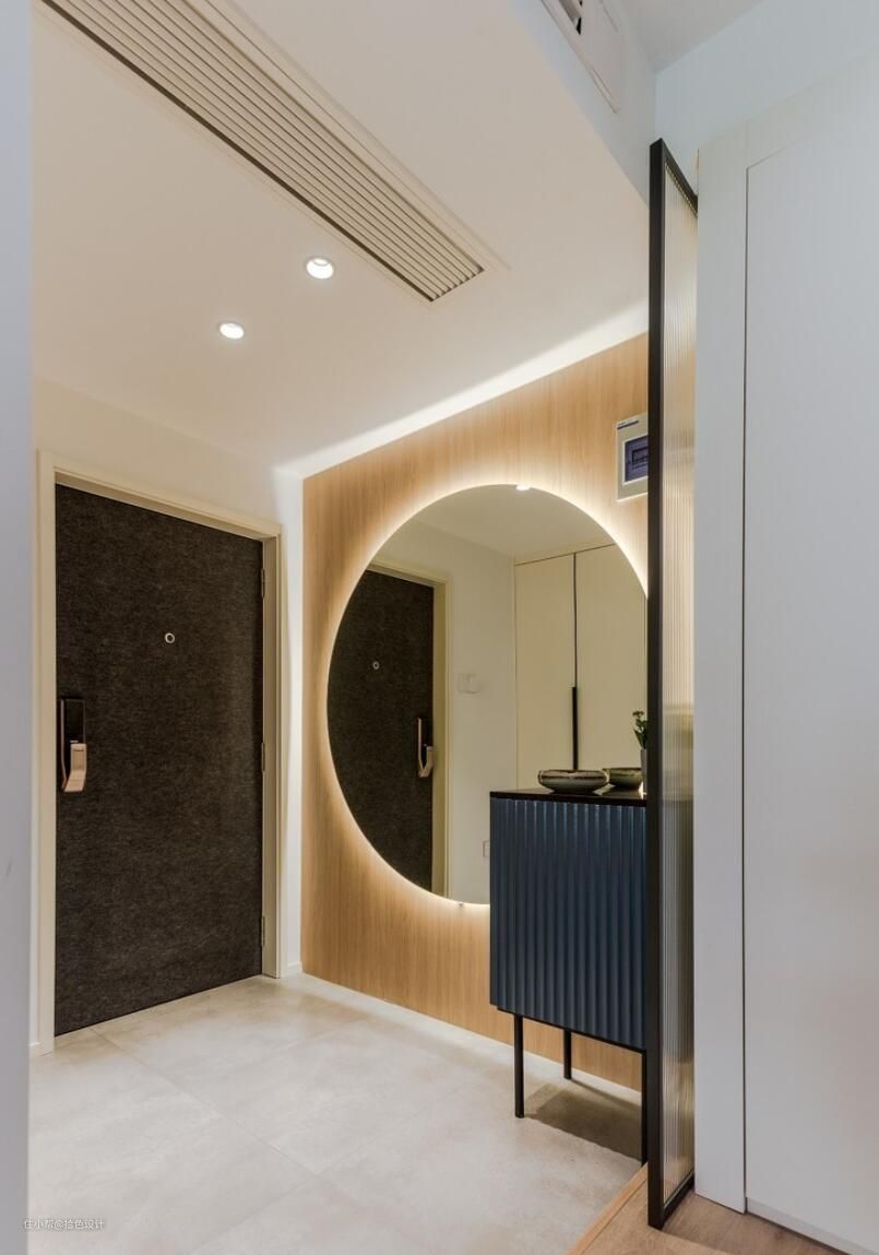 相较于传统的入户全身镜设计,这里直接配置了一面直径1.5米的超大圆形镜,以实现无死角的照镜需求。同时,给镜子加装感应灯光,不仅实现了开门即亮的功能,还让整个玄关区充满了炫酷,从而让入户更具仪式感。而给入户门安装上毛毡,则避开了原猪血色大门的突兀性,并提高了质感。