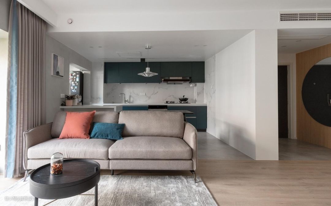 1、结合客厅拥有大横厅结构优势,将厨房墙体拆掉,采用一体化来设计,可以进一步加深空间的通透性,并让空间拥有了社交属性,方便生活交流。