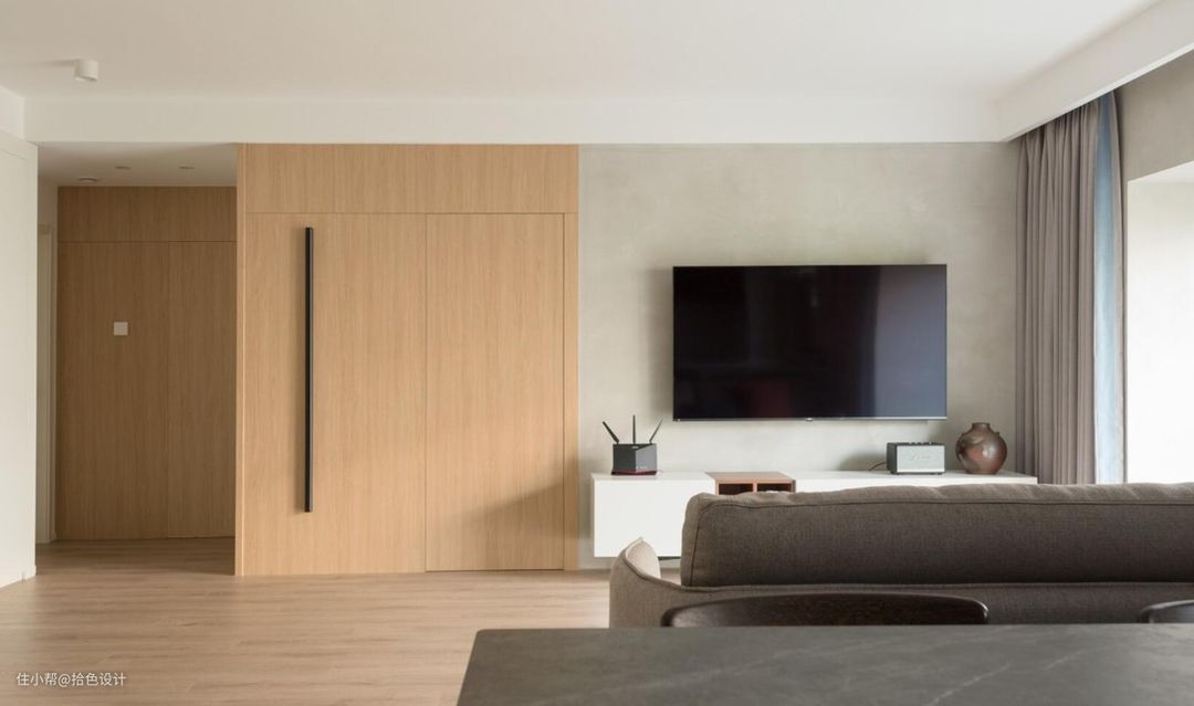 电视墙采用原木与艺术漆两种材质来设计,在延续简约基调的情况下,又丰富了空间层次。同时,还让次卧门实现了隐形,使空间看起来更加工整利落。