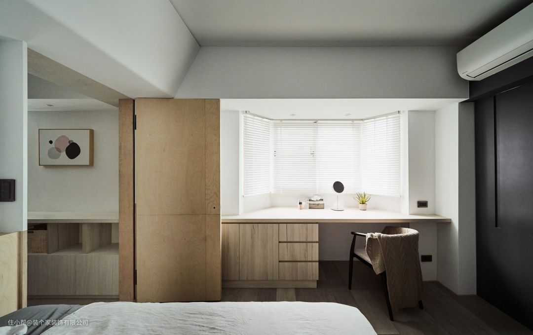 安放私领域的卧室,是精心与尺度较量后的结果,藉由缜密的机能搭配,不浪掷有限地坪里的一坪一吋。运用上下跳色、内外呼应的搭配,扩张场域的宽度。各种延展模糊起两两物件间的接合处,使空间变得有其弹性,拓展了视野上的边界。