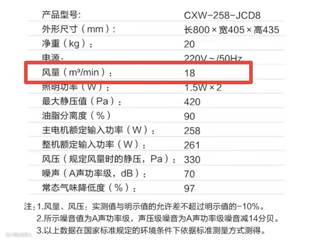 所以能用低风量解决就低风量,除非你对噪音无所谓。普通家用的话,17m³/min—21m³/min足够。有时间最好提前去实体店逛逛,亲自直观地感受下噪声多大,能不能忍受。还有个和风量相关的指标,气味降低度,选购时可以小小参考一下。毕竟很多人是吃的了这口,闻不了这味。像我就爱吃螺狮粉,但偏偏鼻子受不了那味儿。