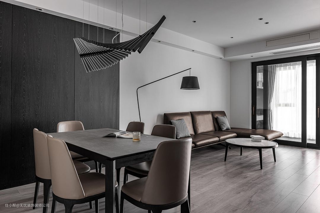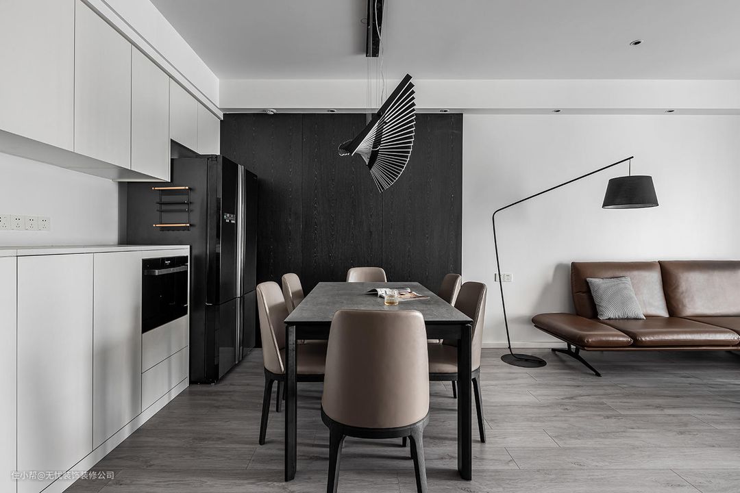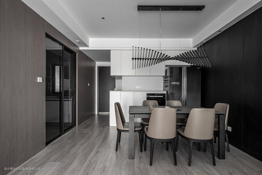 #餐厅 #车水马龙从沉寂中苏醒,黑白咖经典配色从入户开始绵长蔓延至客厅,环绕鞋柜餐边柜直至魅影黑科定板背景墙。