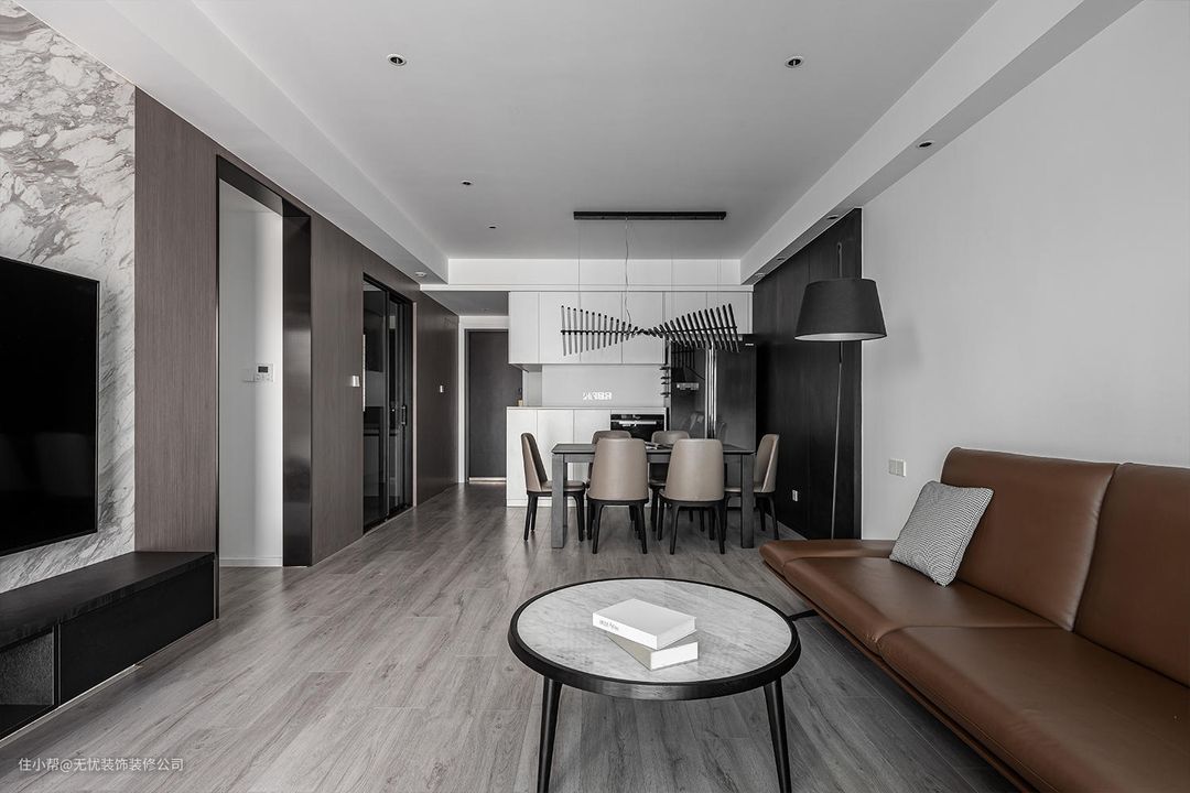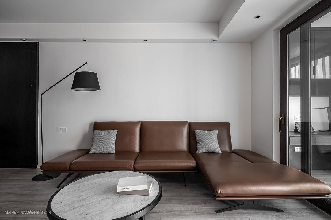 #客厅 #阳光沿着L型落地窗肆意流泻,投射在天然纹理石材的墙面与边几上,窗台外盎然的街景化身自然框景,并与舒适的皮沙发、温润的木饰面共同营造出明朗通透、柔和内敛、舒畅写意的生活感动。