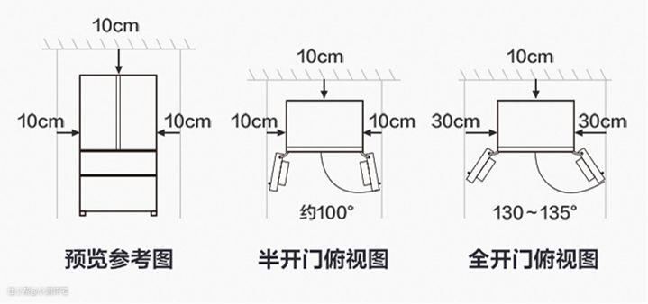 建议不要有“我家冰箱开100°就够了”,绝对不够!不是说你能凑合,用冰箱门的时候不完全打开也行,就可以了。而是冰箱门会自动打开,直到接触到后面的障碍物。