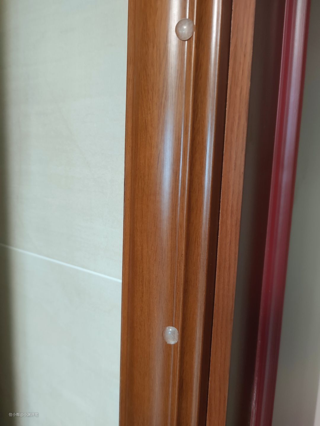 打开冰箱门以后,门就会装在厨房门的门框上。为此,我还专门在门框上粘了几个防撞胶垫▼