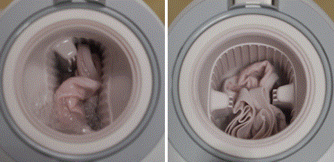 比如独创的softscrub仿手搓清洗方式,专门针对小件衣物,就像图中楼主模拟的这样,衣物在密闭的空间内,被内壁两个大的凸起反复摩擦+翻滚。清洁力更强,且每次最多用水1.5L。