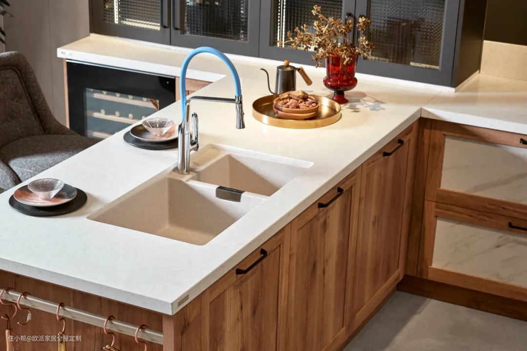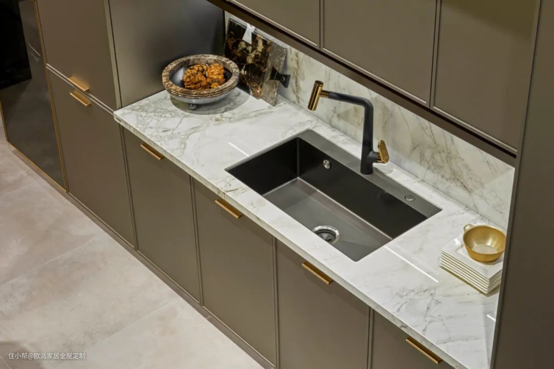 例如欧派橱柜标配的台下盆,采用进口胶水完全密封,不怕边缘发黑发霉,安全环保,还有全金属星盆扣件加固,具备超强承重,体验感超级棒~