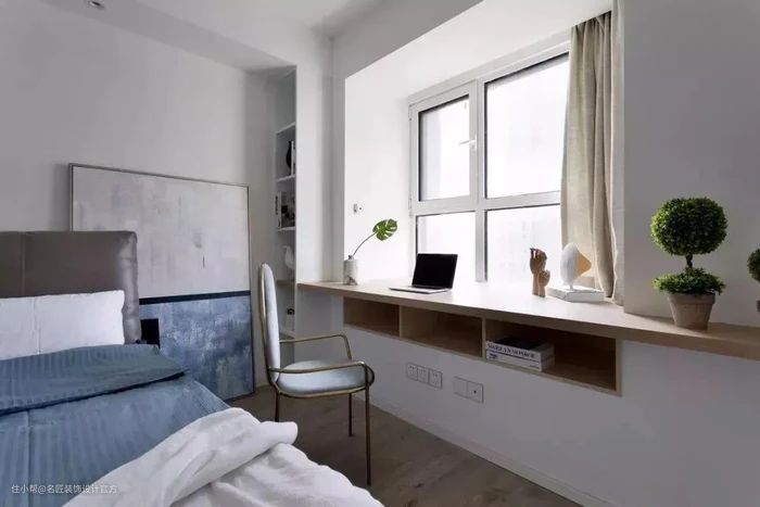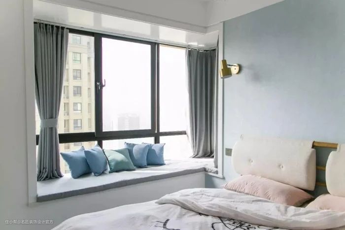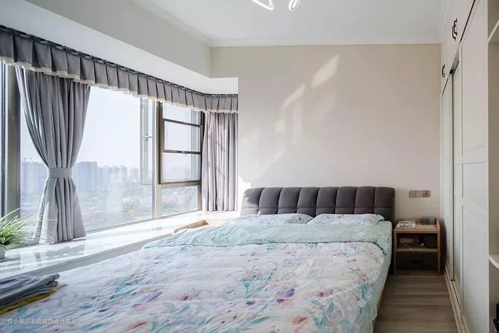 如果卧室的面积过小,把床贴着飘窗摆,1米8床变2米6,几个人横着躺竖着躺都行,又或者把飘窗的空间延伸出来,改造成榻榻米。