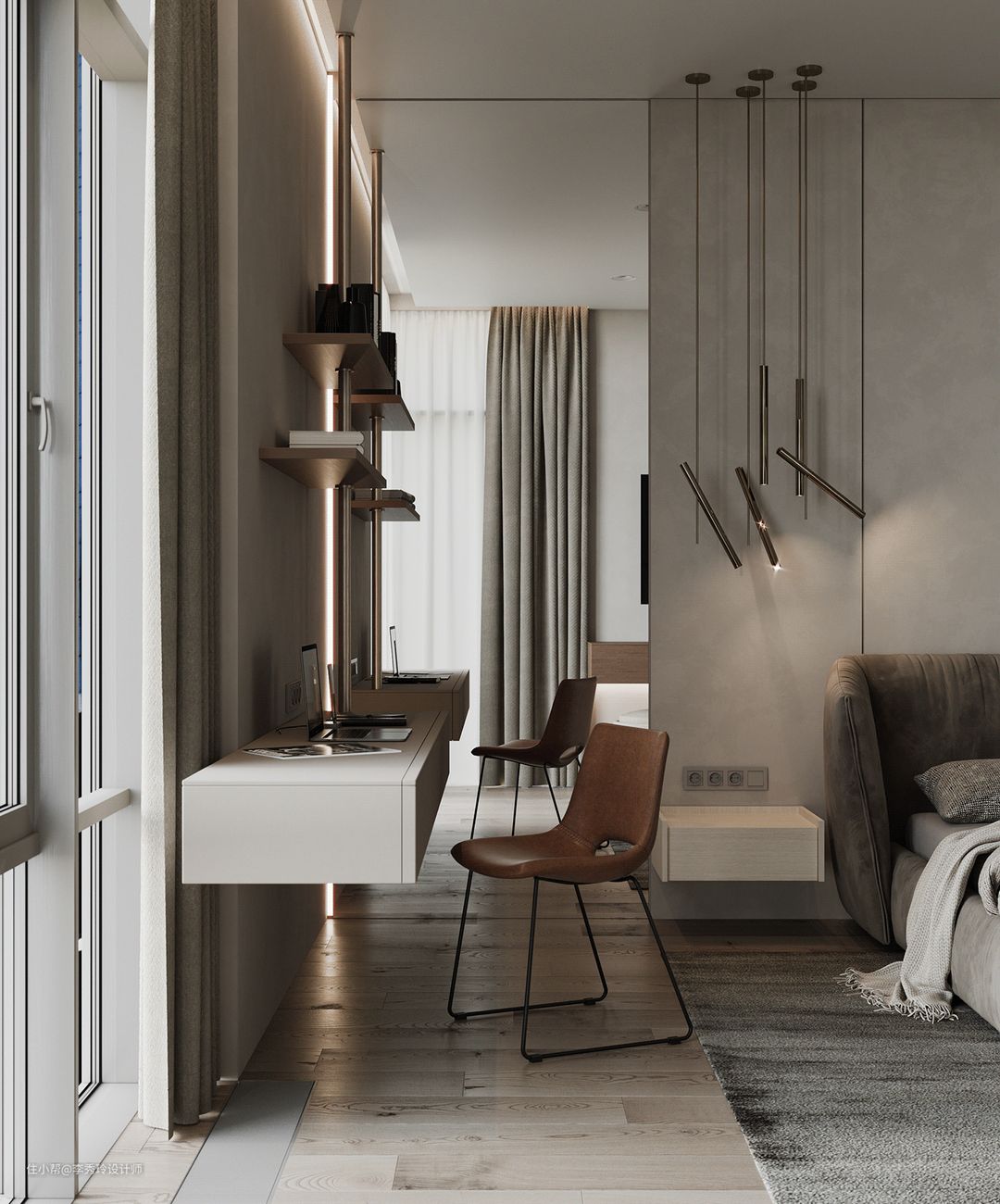 问题来了,卧室书房如何打造呢?空间充裕的,可以像客厅里的开放式书房一样,划一块地儿做书房。
