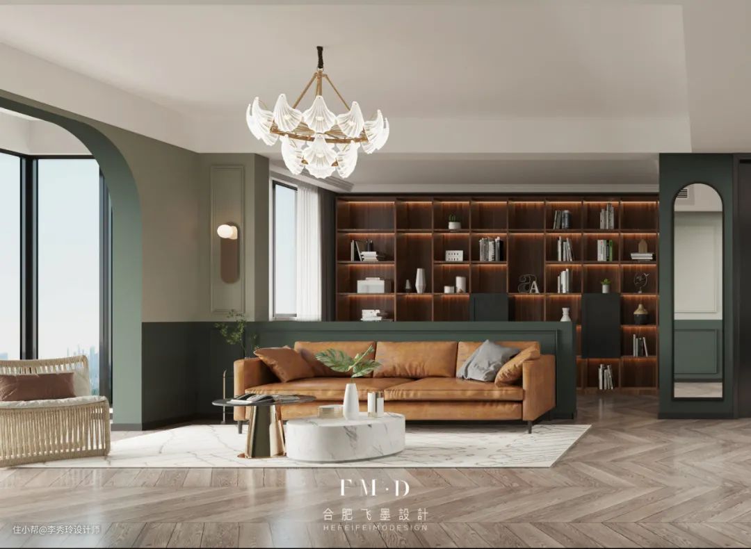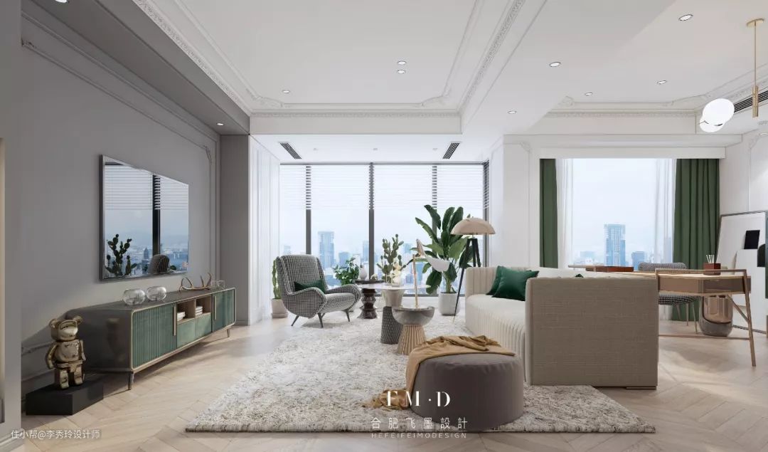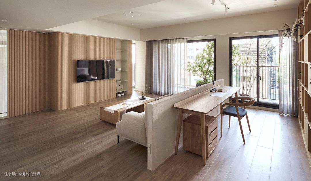 无独有偶,在【信达公园里】这个项目里,客厅是一个横厅,将书房放置沙发后,既不会有太多打扰,又宽敞明亮。