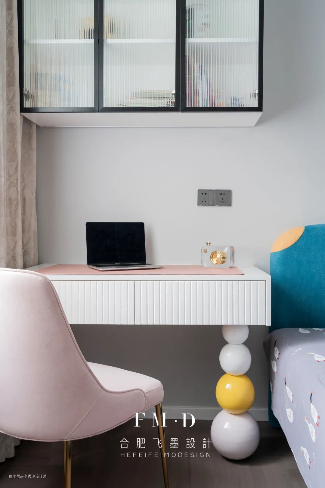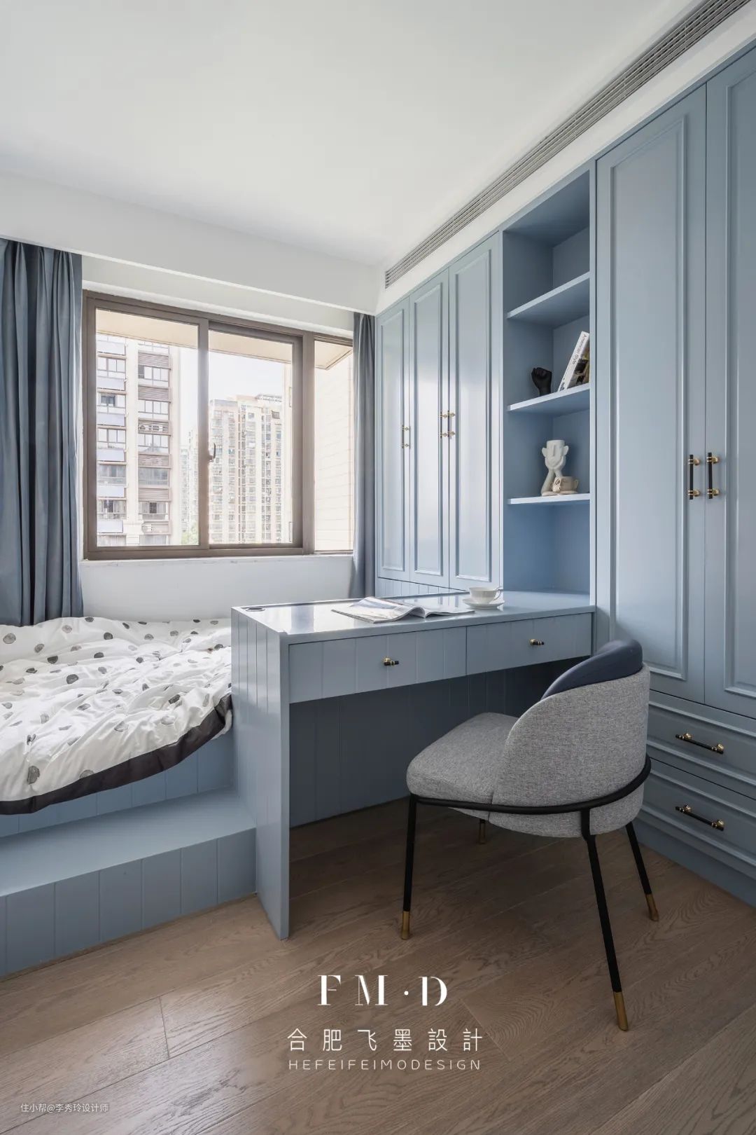 2、书桌可以与床头一体式设计,当然也可以与衣柜一体式设计。