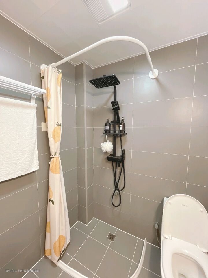 淋浴区的尺寸是70x90cm高219cm,刚好能容纳一个人,再小点洗澡的时候就要碰到浴帘了。