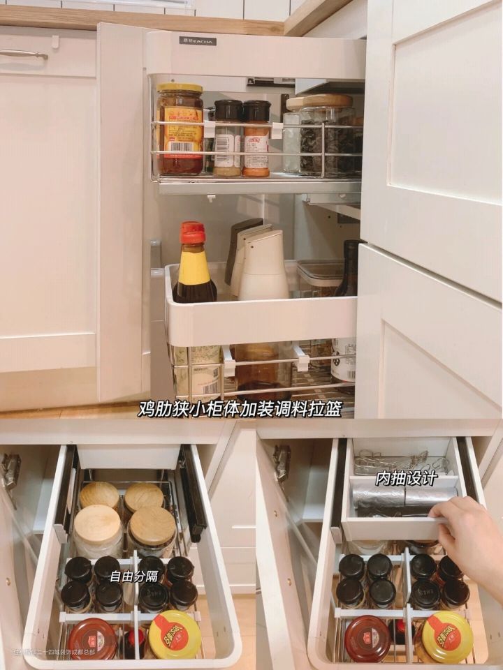 左边鸡肋狭小的柜体加装了双层调料拉篮,台面上空无一物的感觉太好了,各种花花绿绿的酱油瓶,全收在了里面,自带一个内抽,收纳一些零碎小物。
