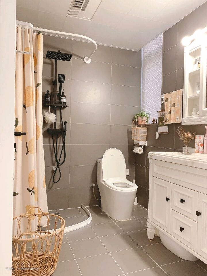 卫生间不大只有4平方左右,尺寸是1.8x2.4m为了实现干湿分离,又不显拥挤,所以用了挡水条+浴帘代替了玻璃淋浴房,好打理适合小卫生间。