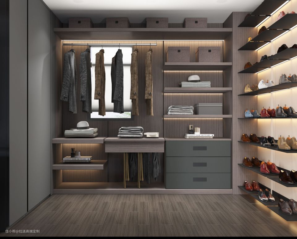 可以同时带有多个收纳格和层板设计,将柜体内部做了细分,轻松解决衣服、鞋子、包包和私密物品的收纳问题。但柜子隔板多只靠顶灯就会有视线盲区,做内嵌灯带光线无死角,使用感更舒适。