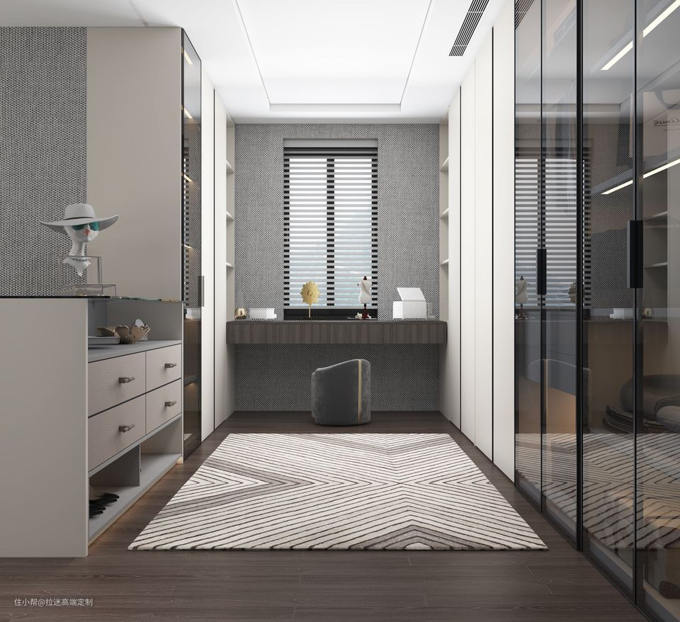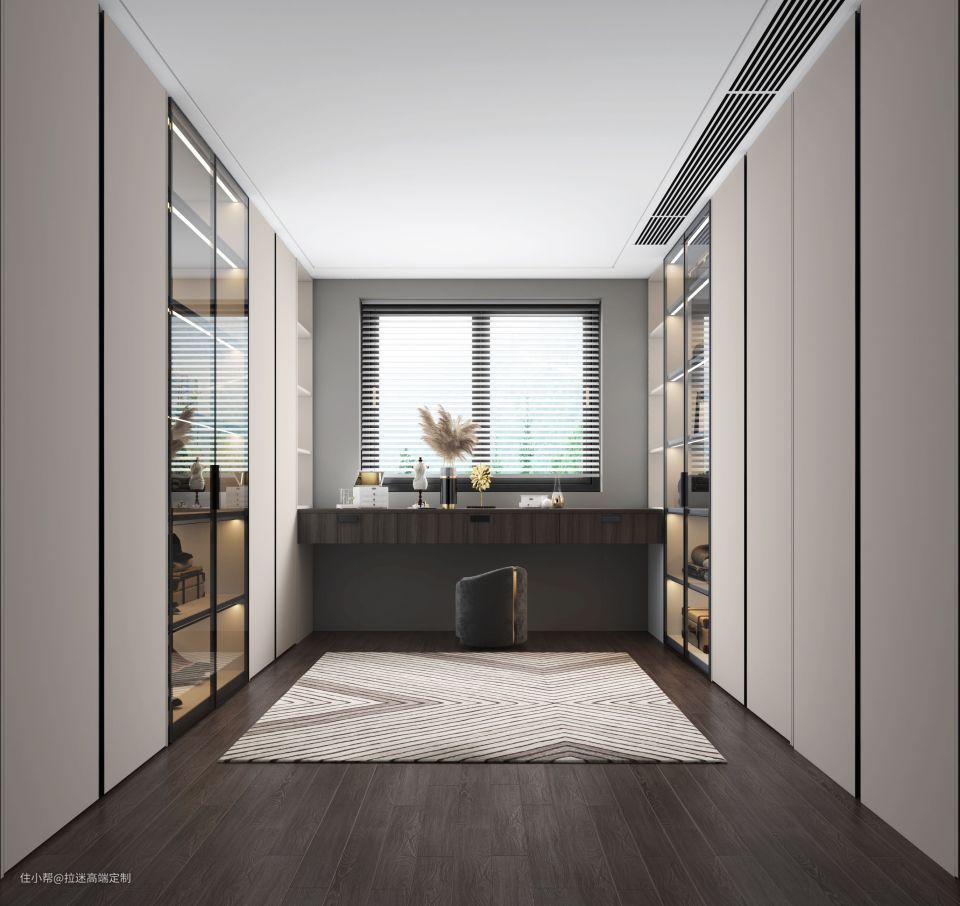 空间足够还可以打造一个玻璃衣柜或者中岛台,带抽屉设计,可以帮助收纳一些零碎的首饰化妆品等,也可以当做操作台熨烫、折叠衣物。同时可以作为隔断隔离换衣区和睡眠空间,还不影响采光,