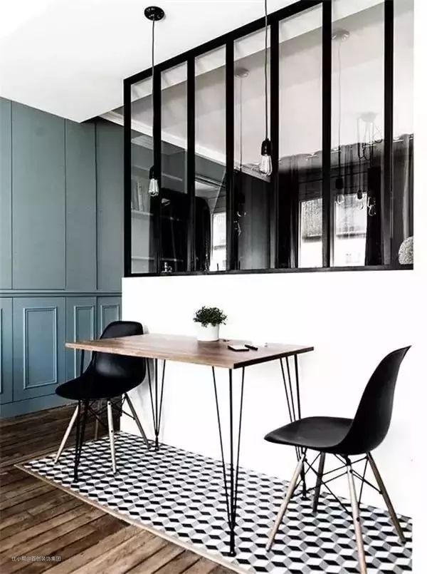 如果担心油烟问题,那就用半墙半玻璃的设计。白色隔断文艺清新,黑色隔断时尚经典。