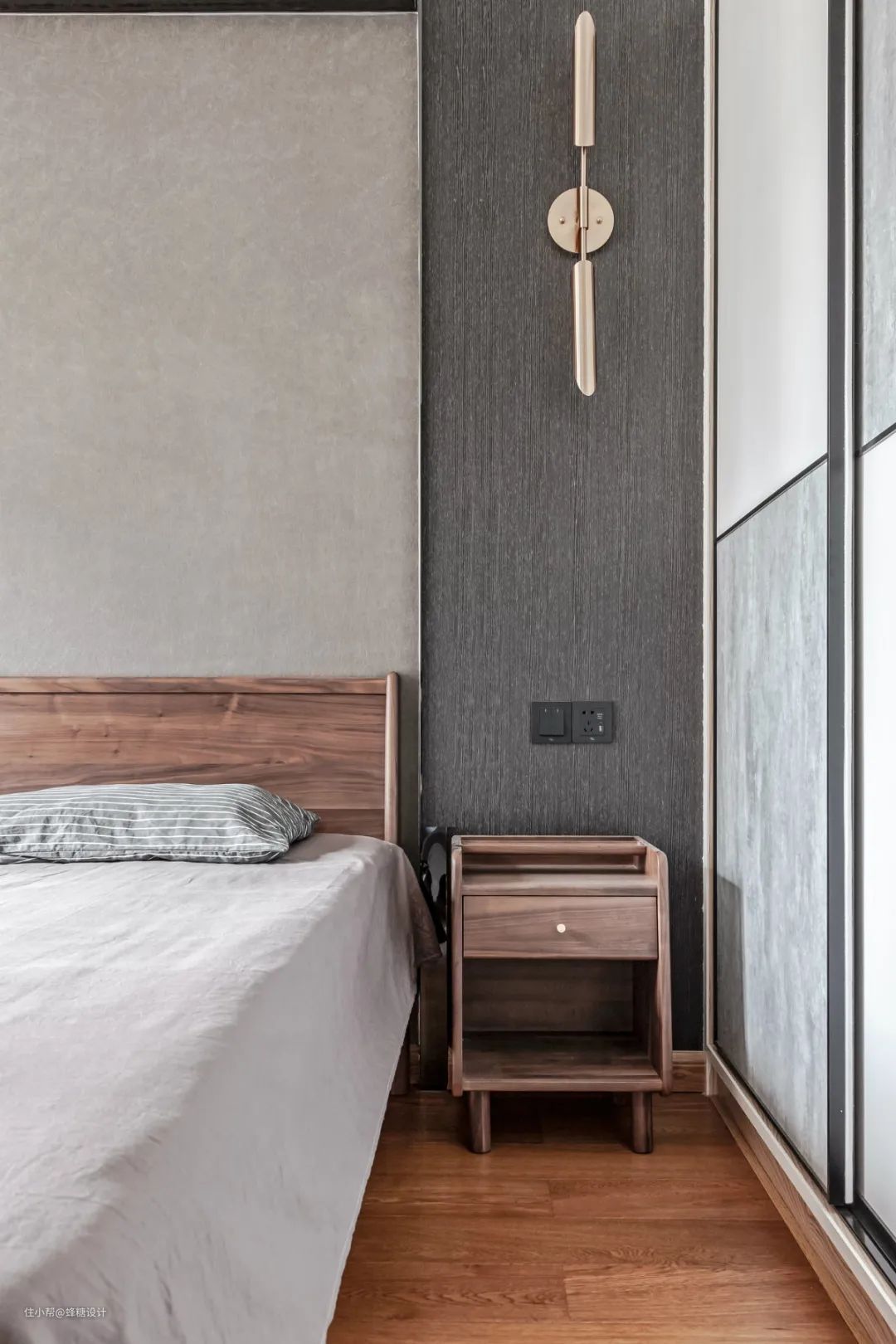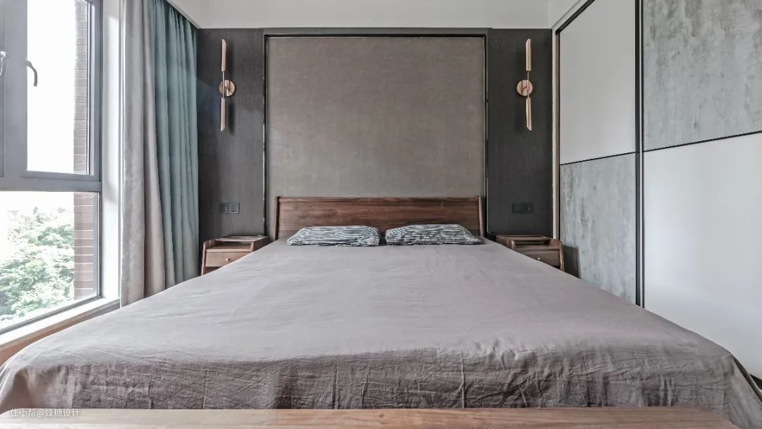 ▲卧室床头墙中间浅灰色+两侧深灰色的设计,两侧还装上金属质感的壁灯,布置胡桃木的实木床,搭配灰色床单,带来一个简约端庄而安静的卧室空间。