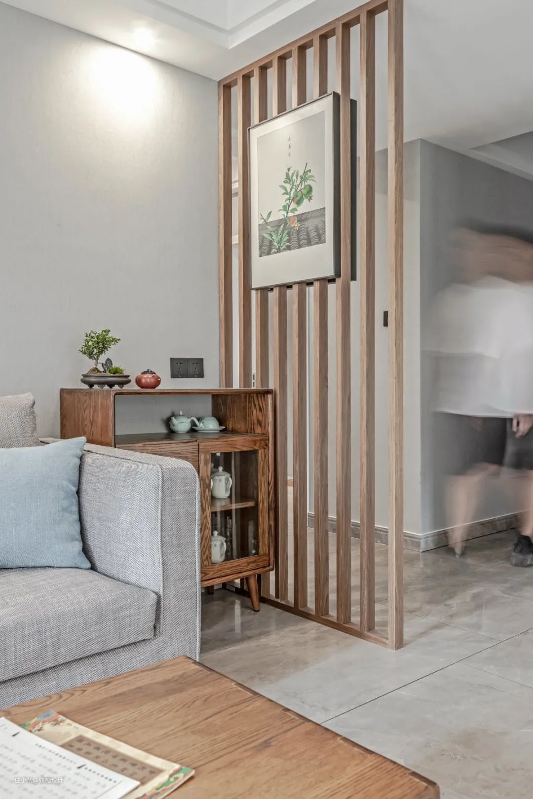 ▲屏风后方就是客厅,在沙发与屏风之间放置一个胡桃木的矮柜,布置茶具、盆景,提升了客厅空间的儒雅与端庄感。而屏风上的挂画,在客厅一侧就是植物图案的画面,也显得更加清新自然。