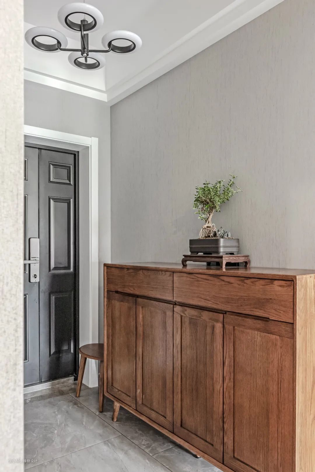 ▲玄关在灰色墙面空间基础,在侧边布置一个胡桃木鞋柜与换鞋凳,鞋柜台面上摆一盆盆景,也增加了回家空间的文艺与端庄气质。