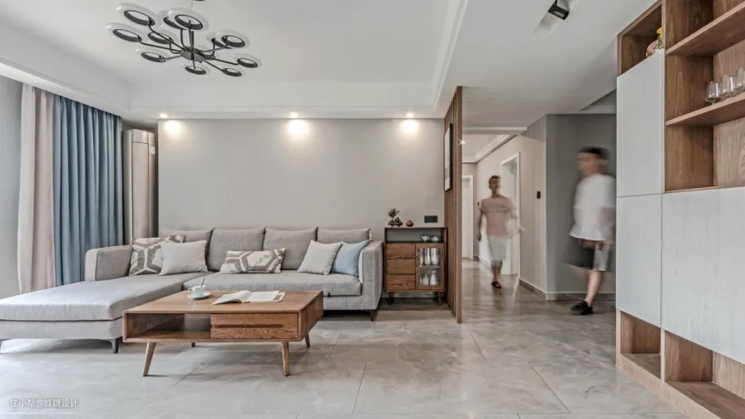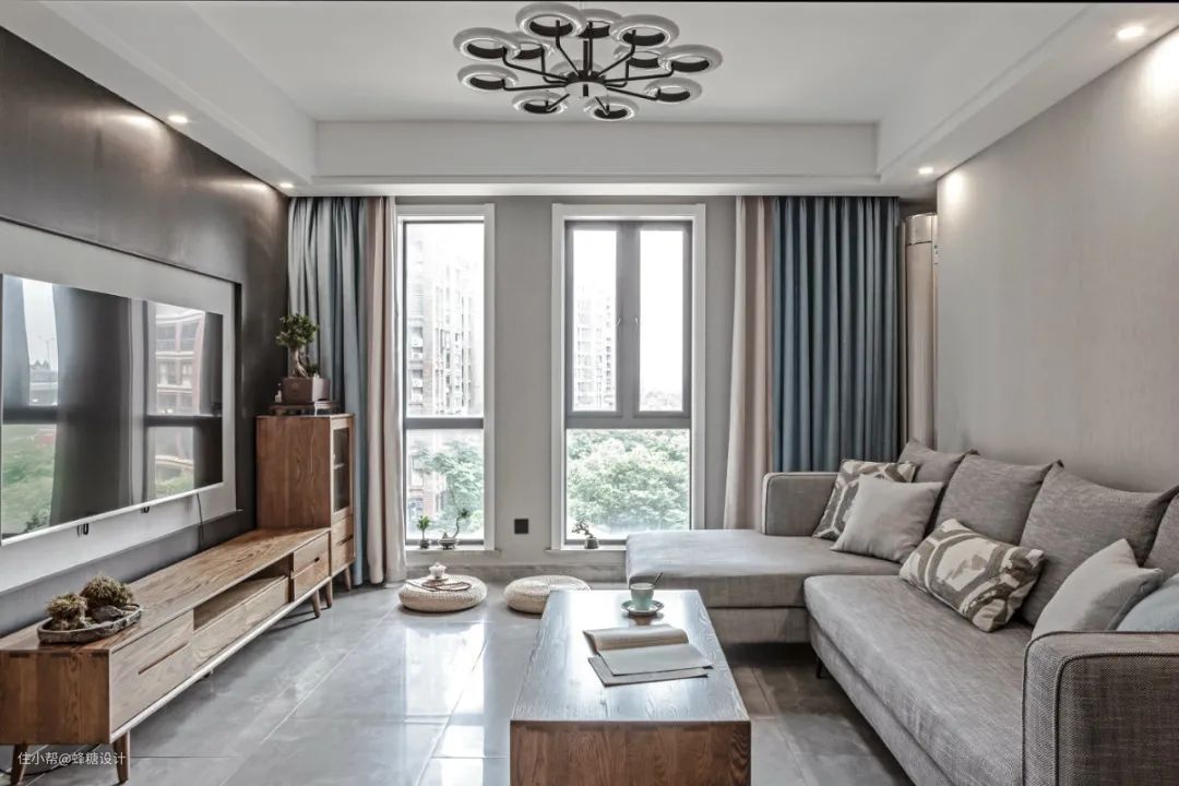 在这套100平米左右的房子中,整体空间以现代风的空间,大面积采取简约灰色的墙面,布置胡桃木的家具,在极简的空间布置上禅意端庄的盆景点缀,让空间显得儒雅端庄而高级华丽。