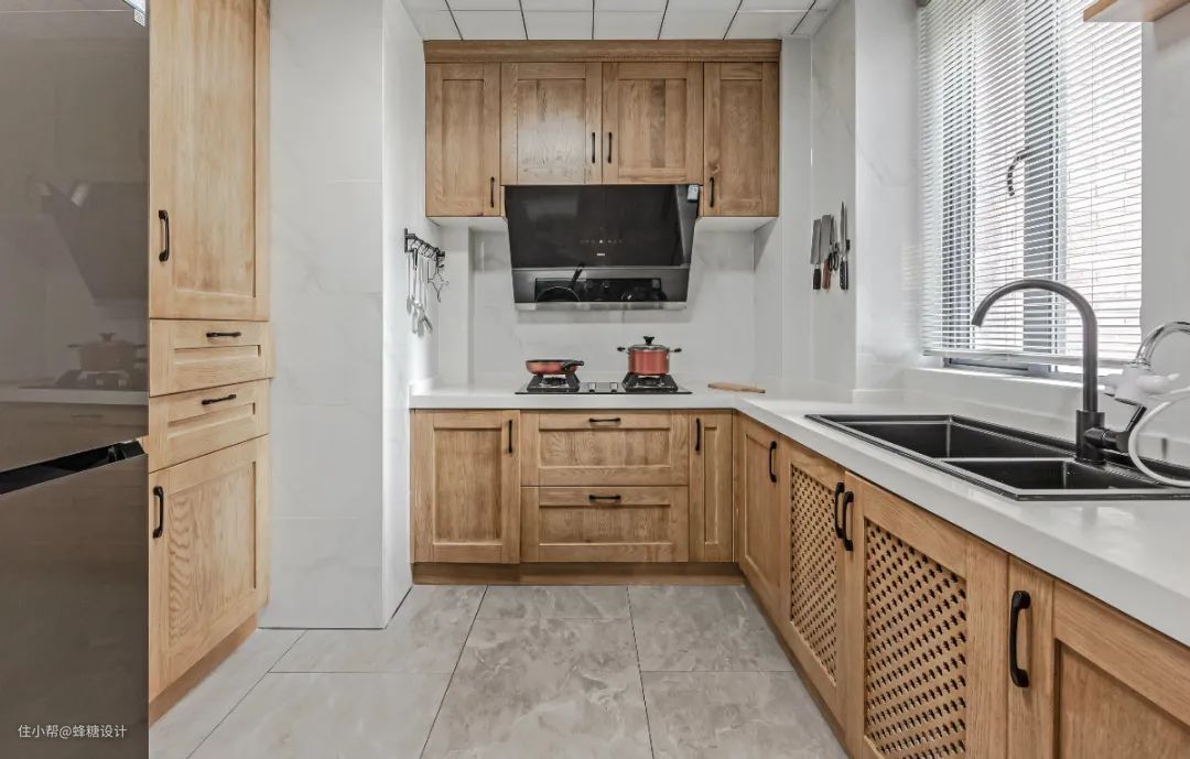 ▲厨房以L形的操作台空间,定制木色的橱柜,打造出一个实用简约的烹饪氛围体验。