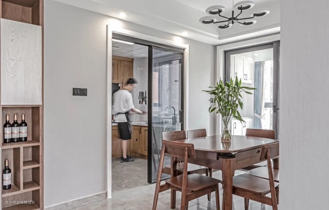 ▲餐厅的窗户采光大面积进入空间,桌上的花瓶与窗外的树木相呼应,带来一个清新舒适的居住氛围感。