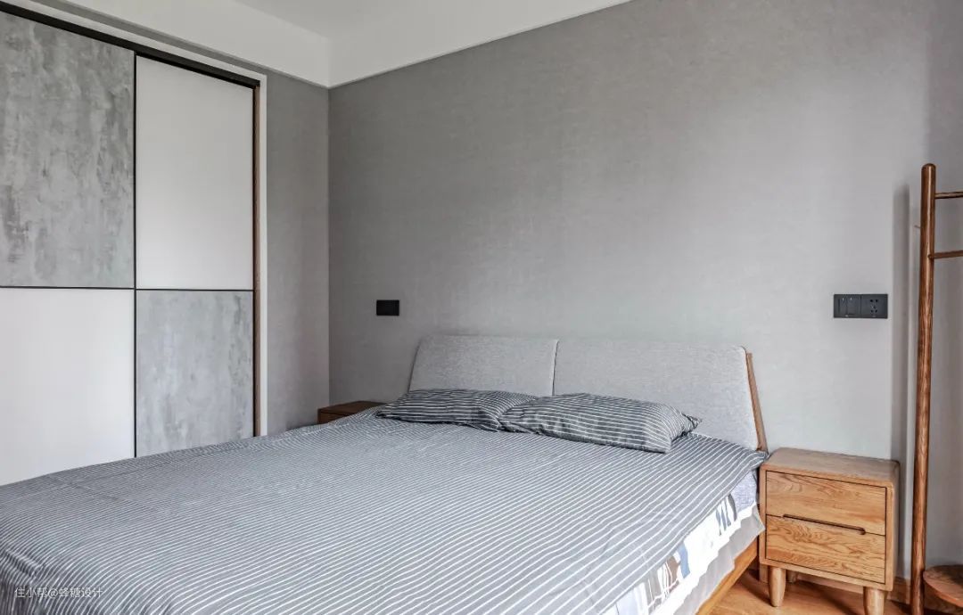 ▲次卧以浅灰色的床头柜,布置一张实木床与床头柜,旁边一个衣帽架,方便外套衣服的挂放收纳;床头靠背垫上布艺软垫,布置灰色带白色条纹的床单,衣柜是灰白配的拼色设计,整个空间灰色与木质的组合,显得简约舒适而大气。