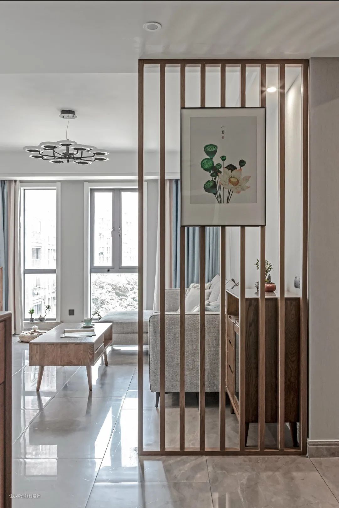 ▲玄关与客厅之间,装上一道木栏屏风,并在屏风上挂上一幅简约的莲花图案装饰画,显得更加文雅而简约大气。