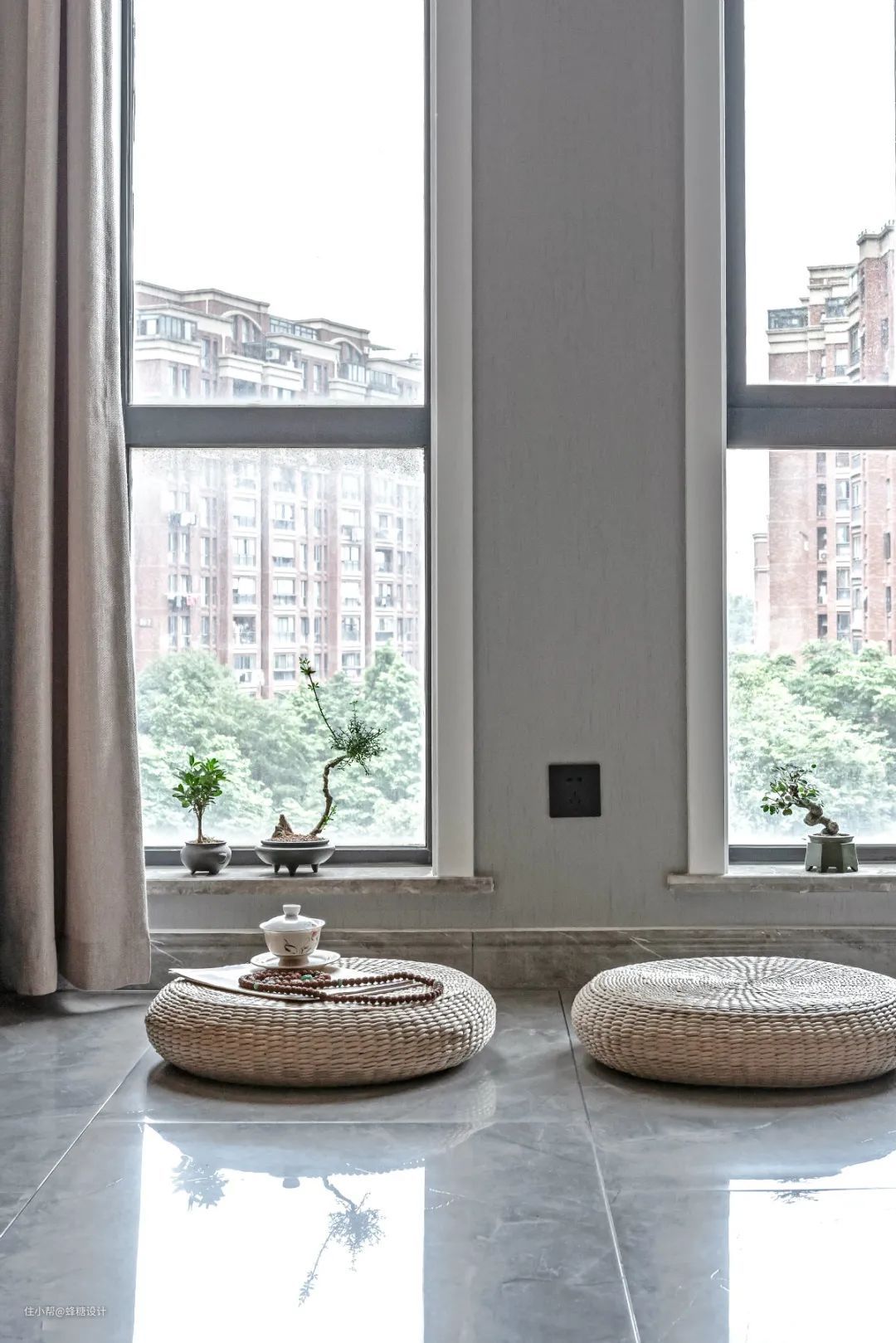 ▲靠窗布置蒲团坐席,窗台上也摆着简约清新的盆景,营造出一个禅意优雅的休闲角落。