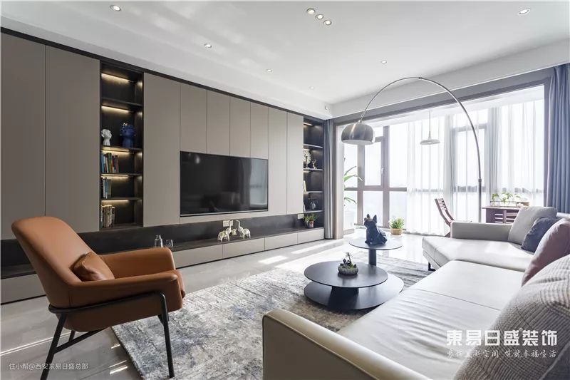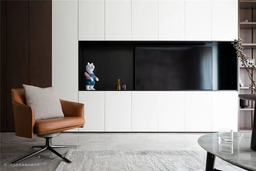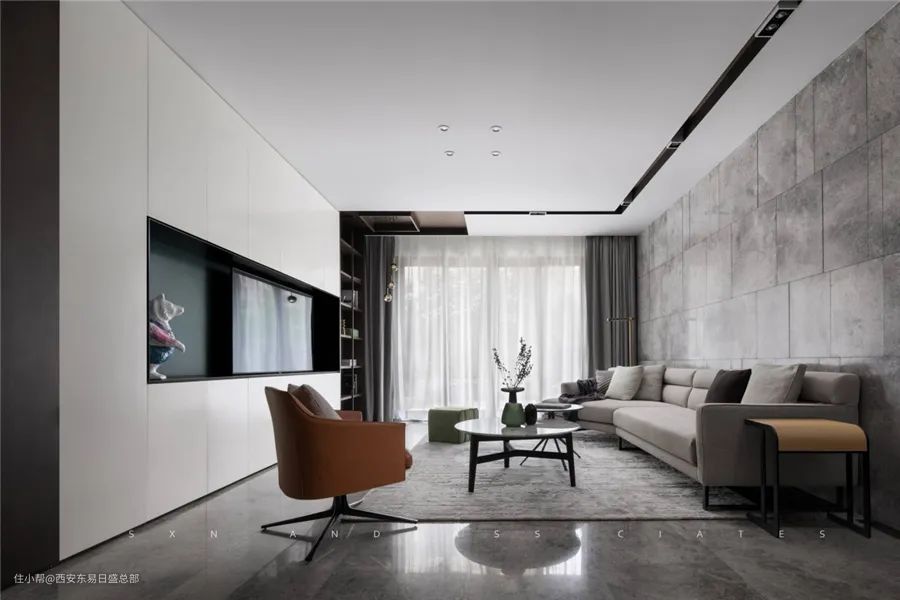 因此客厅在保留原有格局的基础上,进行适当的增加以获得更加出彩的效果。在次卧门口处以隐形门来展现,既融入进整体的效果也让设计风格更加出彩。整个空间内以不同材质形成黑白灰三者关系,烘托出设计风格的亮点。