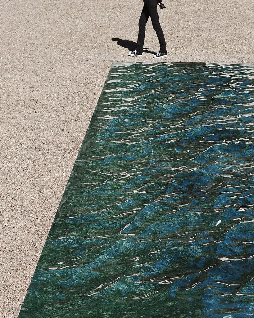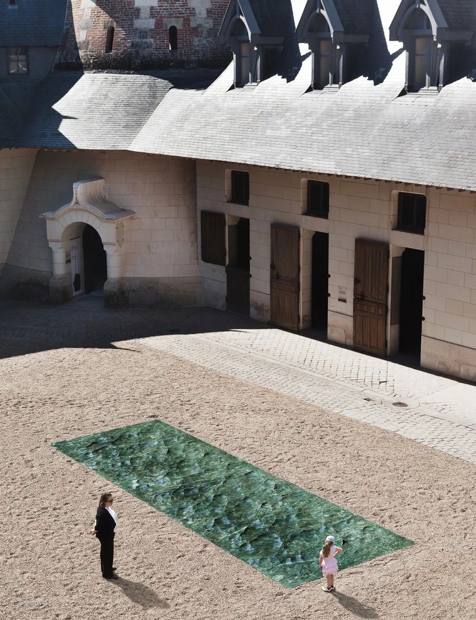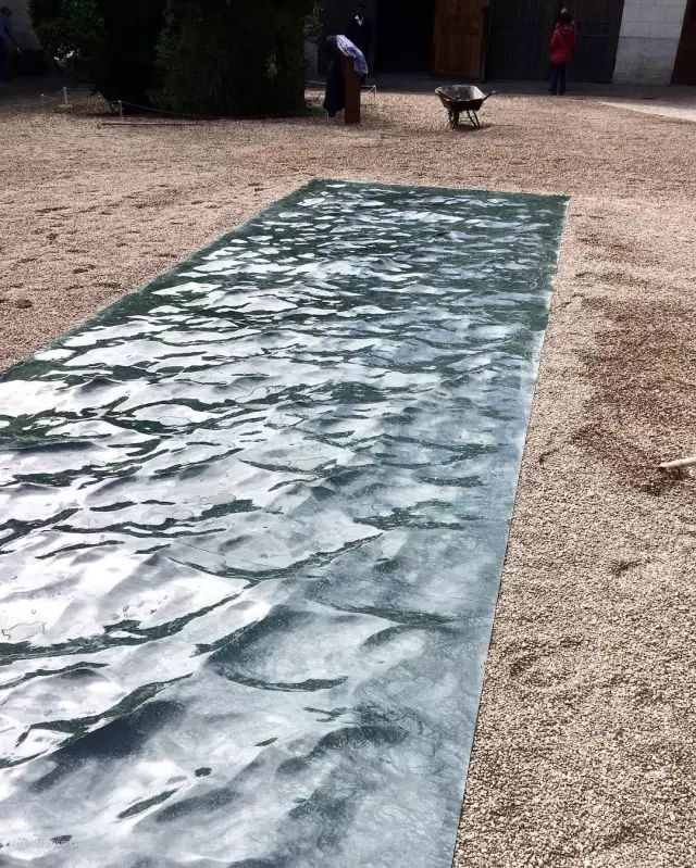 比如下面这个艺术装置,名做「卢瓦尔河」,古堡的庭院中铺满了细砂石,出现了一潭碧水,阳光下水光交织的样子,让人不敢相信它的材质竟然是产于危地马拉的绿色单片大理石。