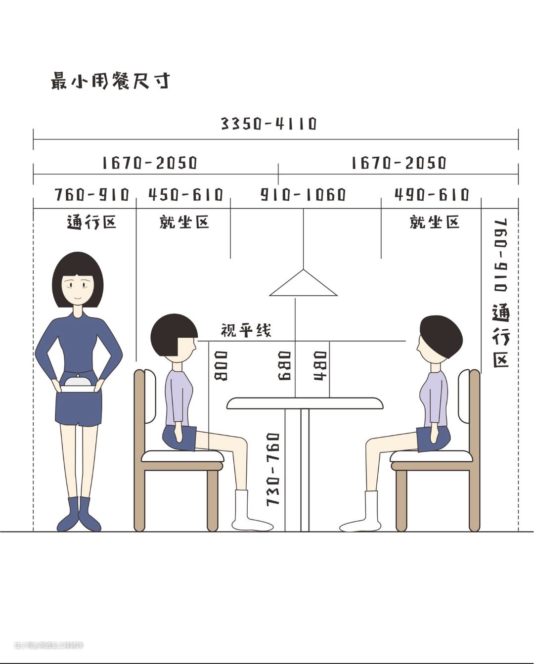 比较常用的有760mm * 760mm的方桌和1070mm * 760mm的长方形桌。桌高一般为710mm,适合配415mm高度的坐椅。餐桌的宽度不能小于700mm,否则家人对坐时很容易因餐桌过窄而产生脚碰脚的情况。