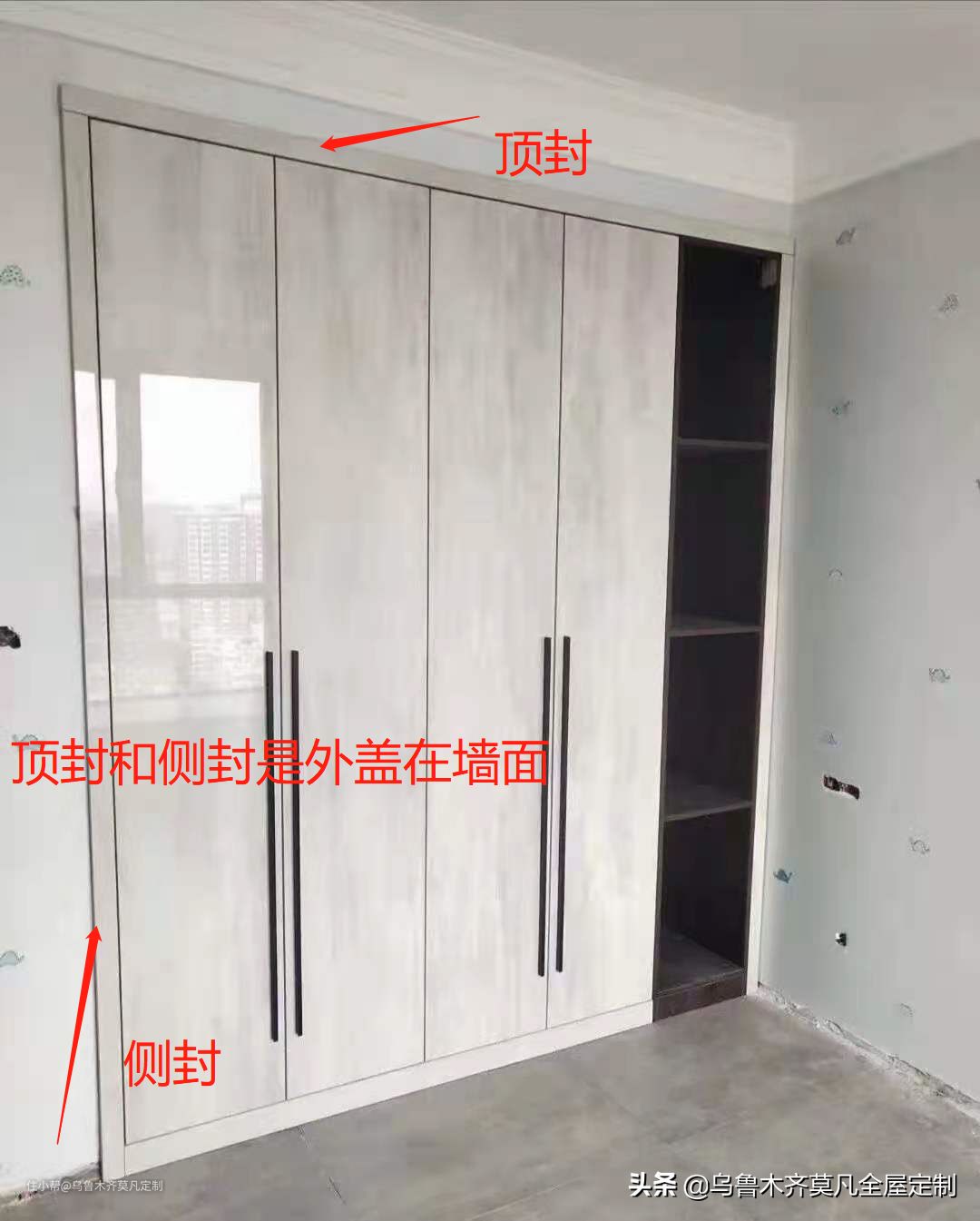 衣柜和顶封和侧封的安装方式,有2种,一种是和墙面齐平,一种是外盖在墙面上。通常外盖墙面的安装方式,需要在木工期,做好衣柜的顶封和侧封板,衣柜封板再外盖在上面,这样的安装方式,壁纸,壁布等,都好收口,而且和墙面的缝子也收的好看。