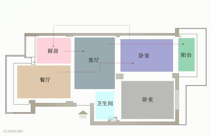 原始结构图,入户正对着客厅,厨房偏隅一角,比较狭小,餐厅后来在原房东二次扩建中,增加了飘窗,两个卧室秉承了上个世纪的住宅样式,非常宽敞,一个混合所有功能的独卫。