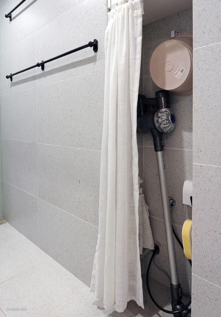 右侧一点点的储物空间也不放过,上方设置吊柜,下方用布帘子遮挡,收纳卫生洁具。