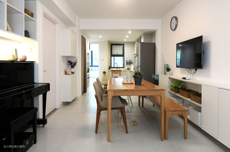 墙面和柜体都采用了大面积的白色,减少色彩复杂带来的繁复感,一张1.8米长的原木大餐桌,既是餐桌,也是工作桌。