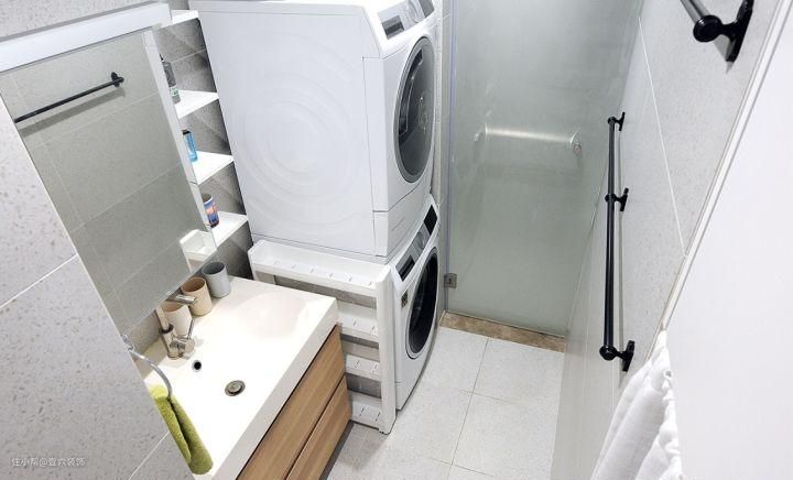三分离式的卫生间,满足一家四口同时使用的需求。干区放置洗脸台和洗衣机以及干衣机。