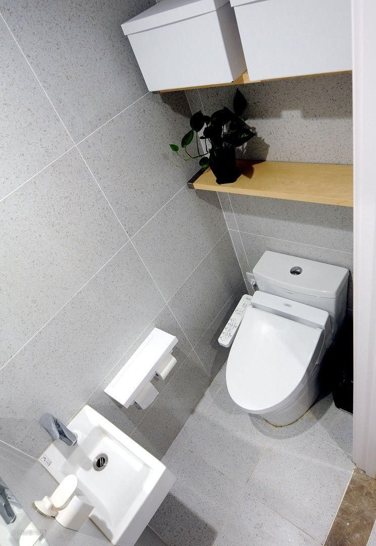 俯瞰厕间,尽管不大,功能齐全,层架可收纳双11你囤的卷纸,双桶厕纸架避免坐下来才发现没有纸的尴尬,迷你挂墙式洗手盆满足如厕后的需求。