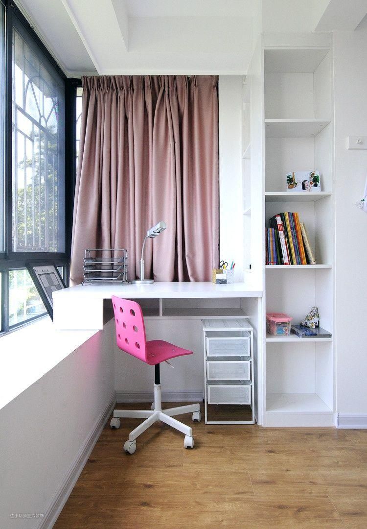 这间是姐姐的房间,大面积飘窗,尽管在北面,采光仍然十分充足。结合飘窗的位置,设置了书桌和书柜。