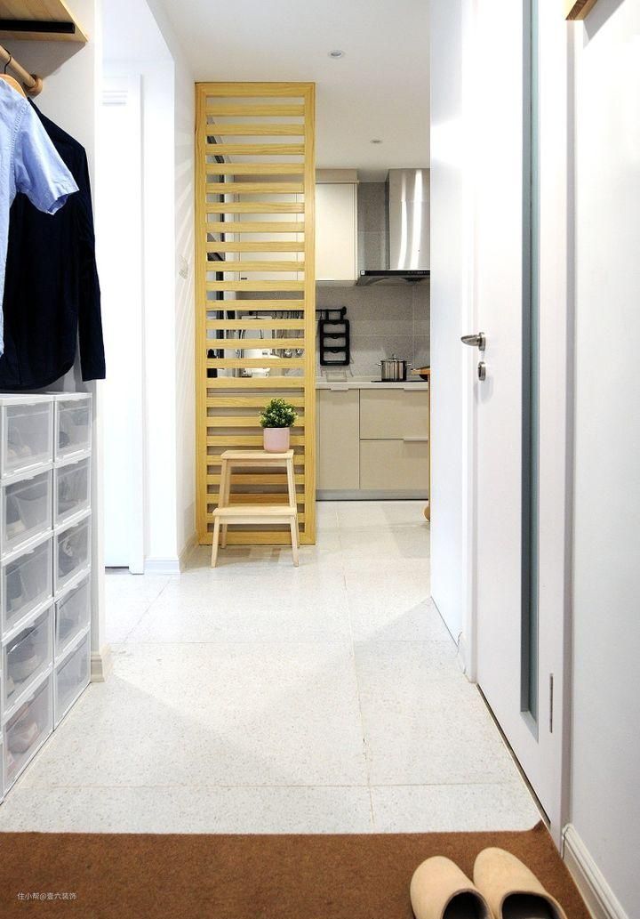 进门即可见到开放式厨房,加设一道木质屏风做一个遮挡,玄关的通道右侧是三分离卫生间之厕间的门。
