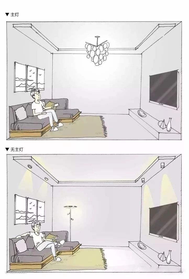 ▲有主灯空间整体明亮,但无法切换格调及生活情景,无主动空间整体暗,但可根据需要控制各区域的灯光变化。