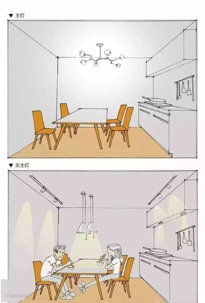 ▲有主灯餐厅几乎可以做到无死角照明,但无法对局部进行强调,无主灯餐厅,每个部位可根据需要进行灯光设计,实现多种生活场景融合,餐桌吊灯能突出用餐区,促进食欲,橱柜射灯突出照亮操作区,避免人挡住顶灯照明带来的死角。