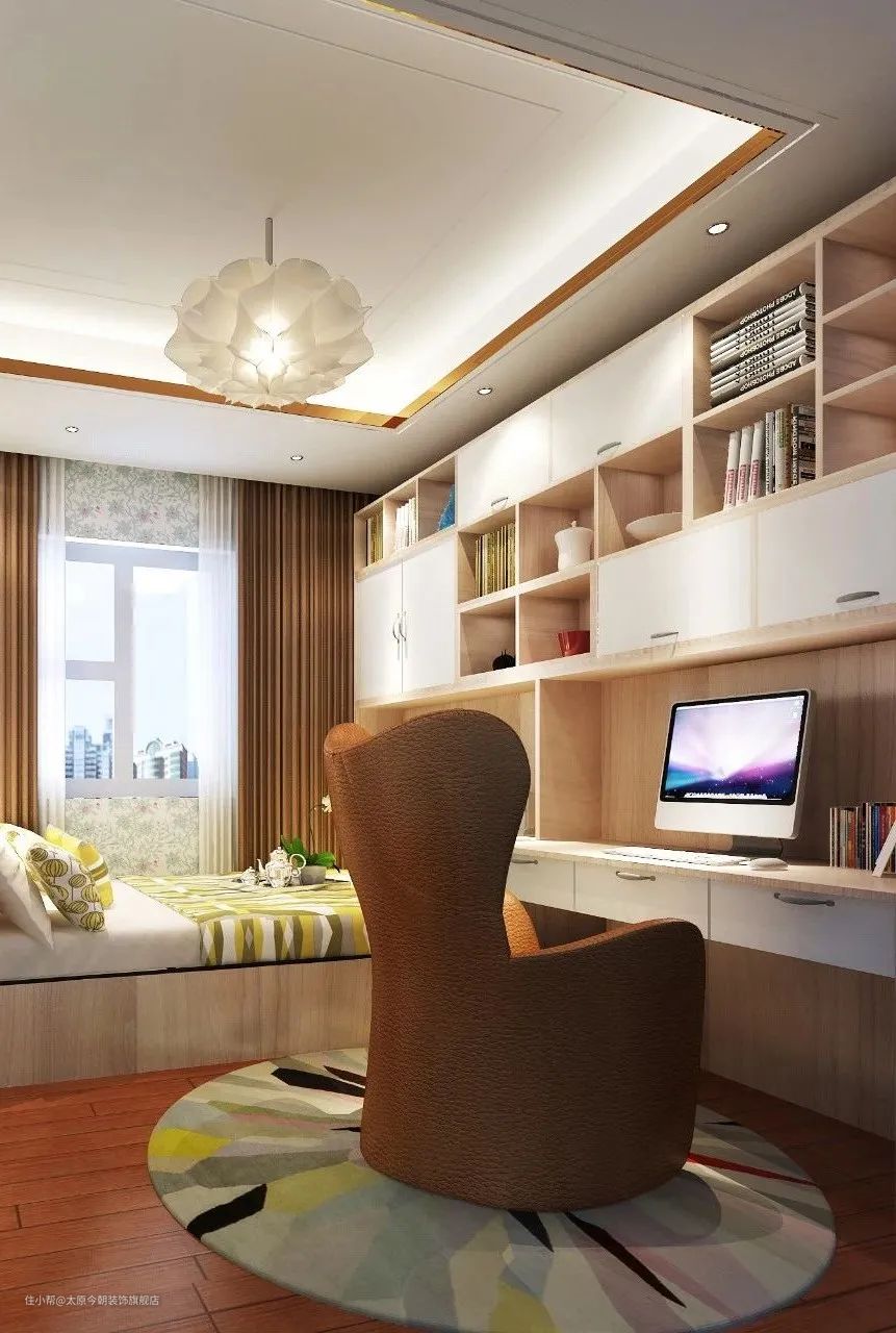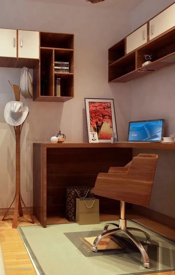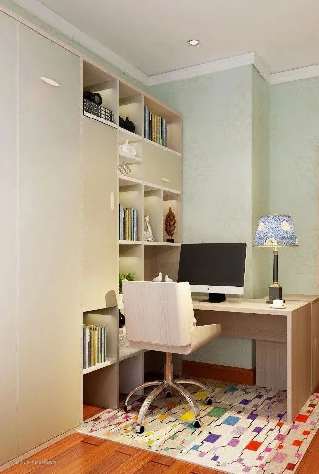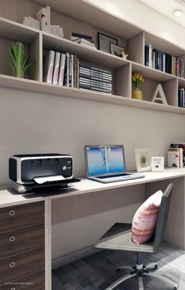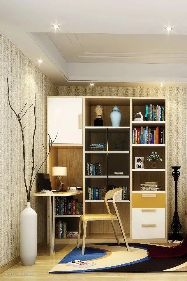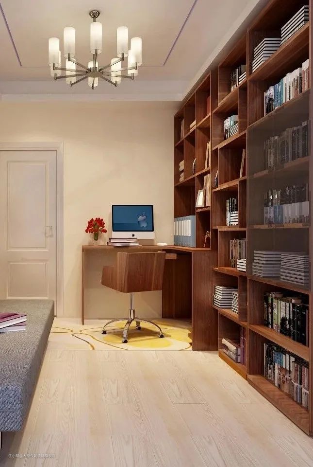在布置上,迷你户型一般采用阅读角的设计,不占用过多空间,只需一个角落用于阅读与工作即可;小户型书房可采用整体书柜书桌,这样会让空间显得紧凑有致,节约了不少居室空间;大户型一般采用独立的书房,不仅可以营造安静的环境,还创造出了一个独属于居室主人的精神世界。