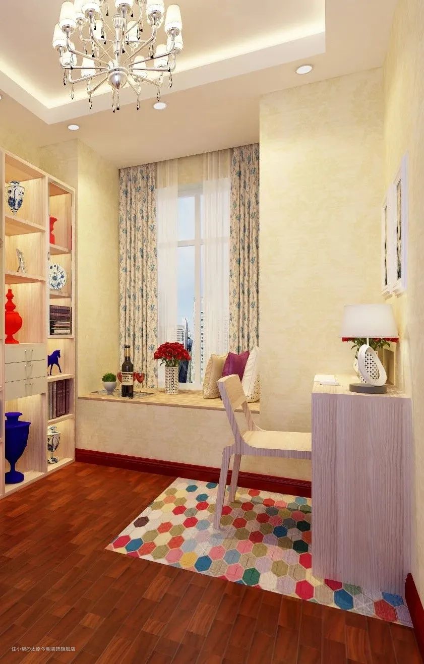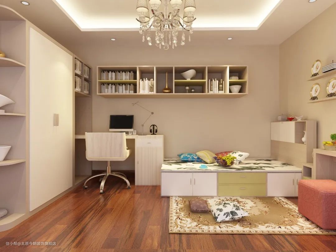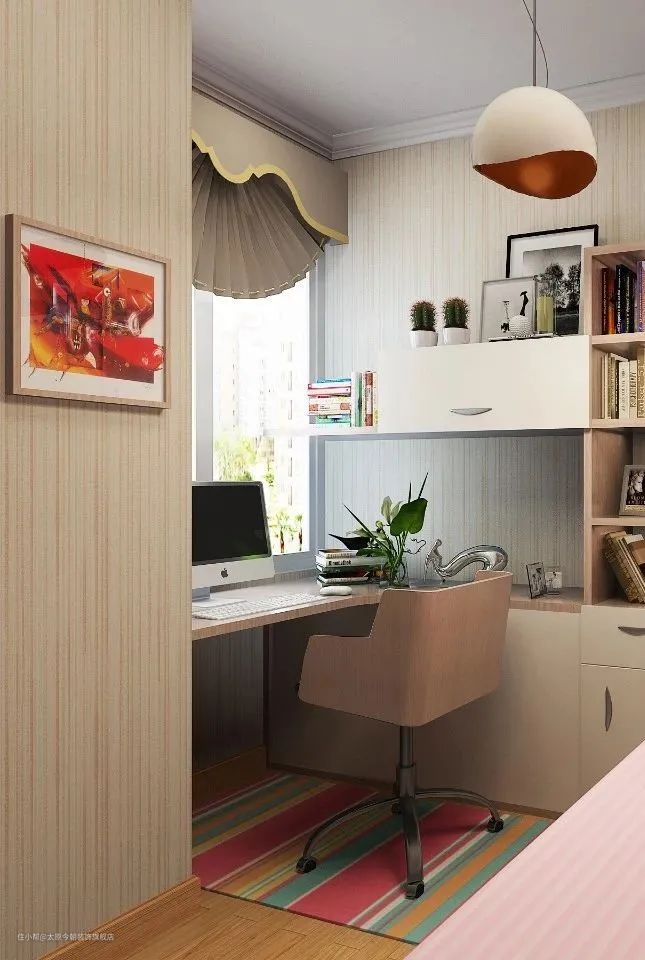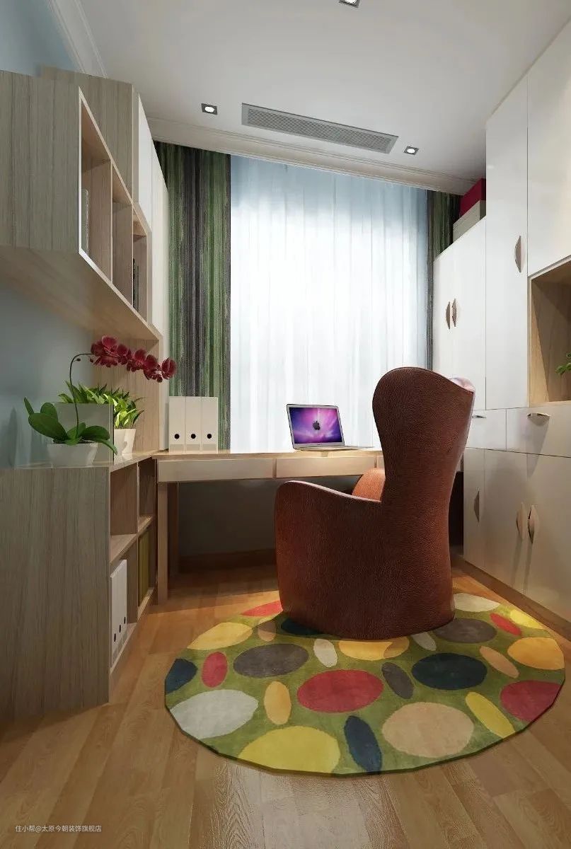 在布置上,迷你户型一般采用阅读角的设计,不占用过多空间,只需一个角落用于阅读与工作即可;小户型书房可采用整体书柜书桌,这样会让空间显得紧凑有致,节约了不少居室空间;大户型一般采用独立的书房,不仅可以营造安静的环境,还创造出了一个独属于居室主人的精神世界。