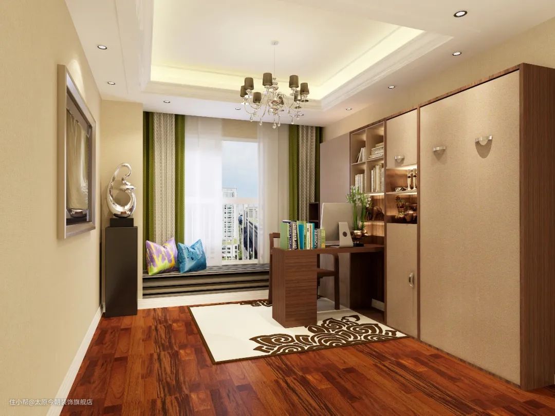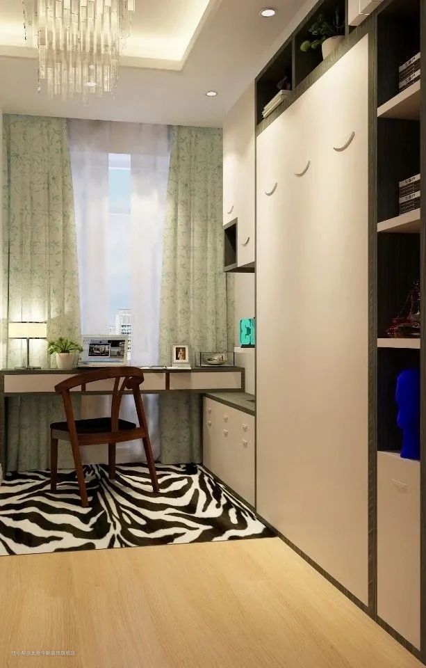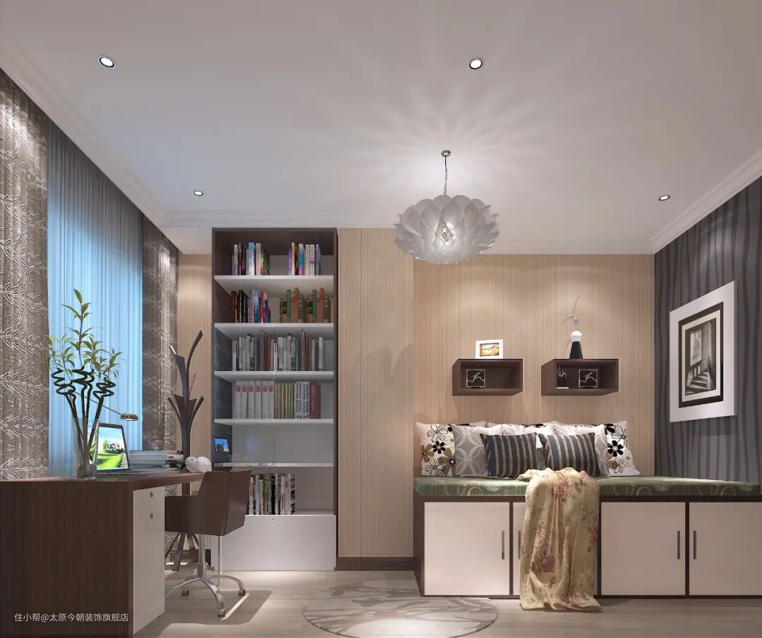 在书柜方面,一般和书桌椅在款式、造型细节和颜色方面要统一,采用相同色调和材质来进行装修。带柜门的书柜,更便于清洁、打理和收纳;开放式书柜,兼具收藏与展示功能。小空间的书房可以考虑壁式的书架;大空间的独立书房,可以试试顶天立地式的大容量书柜,让整个空间更有安静、厚重之感,凸显文化氛围。