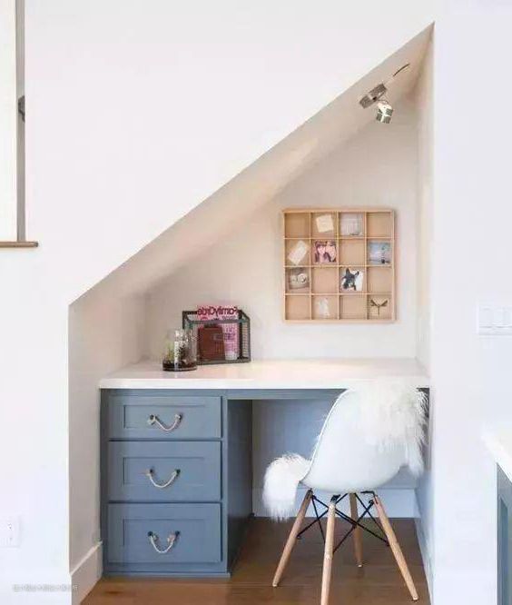 楼梯下的空间被很多人视为“鸡肋”,用来堆放各种杂物,非常那个影响空间的品相。其实这个空间非常适合做一个小书房,将空间充分利用起来,多一个功能区它不香么?