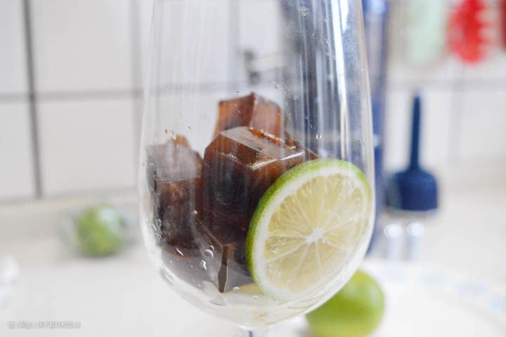3、杯子里放入青柠,再倒入咖啡冰块。