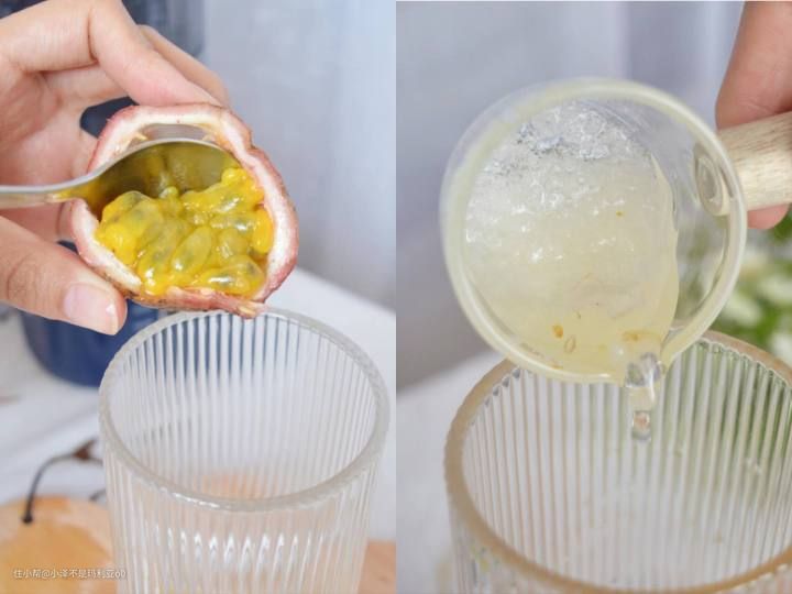 2、杯子中倒入一颗百香果,加入两勺蜂蜜。