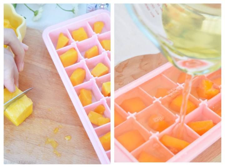 2、芒果切成小块,放入模具中,再把乌龙茶倒进去,冷冻成芒果茶冰球。